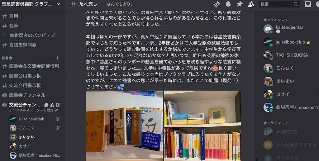 彗星読書倶楽部は、無味乾燥な日常に呑まれそうになる中で、好きなものや興味のあるものを見失わずにいるために必要な場所になりました。